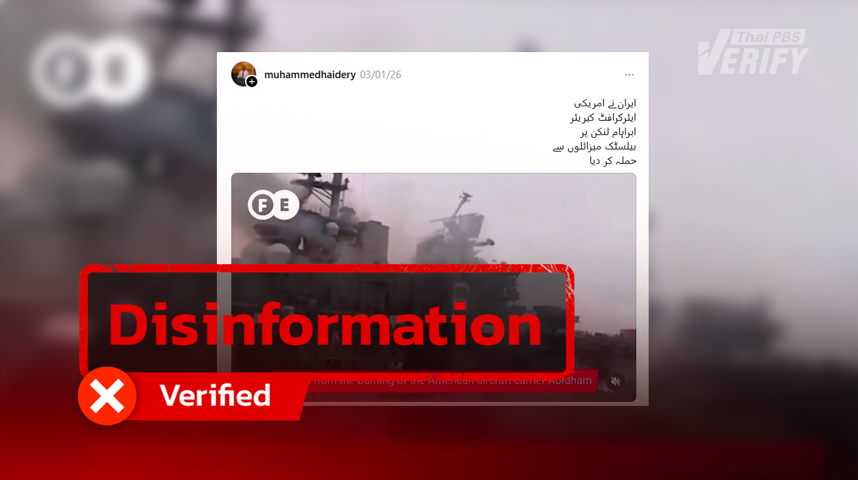 Thai PBS Verify identified a video post on Threads by user ‘ muhammedhaidery,’ on March 1, 2026. The post alleged that Iran had sunk the US aircraft carrier Abraham Lincoln (CVN–72). The caption reads: